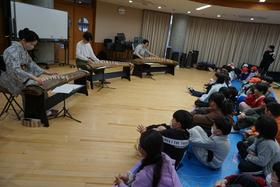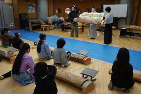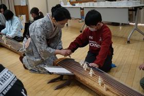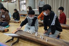 4年生のクラスを半分に分けて、石神ホールで2、3校時にそれぞれ琴教室を行いました。 今回は琴の先生にお越しいただき、「さくら さくら」の演奏に挑戦です。 |