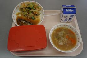 給食のメニューは、ご飯・牛乳・いわしの生姜煮・カリカリ大豆サラダ・根菜の味噌汁。 食材には、2月3日の節分にちなんで、「大豆」と「いわし」が登場しました。